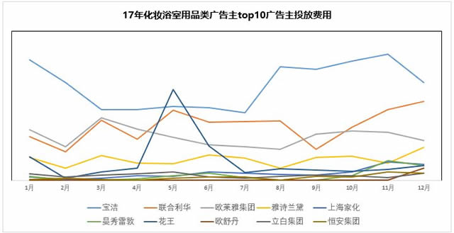 化妆浴室用品类点:保湿类产品大幅增加投放,京润珍珠值得关注 从2017年的8月开始,化妆浴室用品类一直呈现上涨的趋势,且10月、11月上涨明显,11月达到了15%的环比增幅,所以即使12月有了4%的下滑,也收入了35367万元,全行业中排名第五。 化妆浴室用品行业中,2017年宝洁几乎一直是领跑行业的第一名,11月上涨5%,在17年的投放首次突破了亿元,12月有了小幅下滑,以7872万元的收入依旧排名在第一位。其中,宝洁对旗下的玉兰油投放在12月份有了14%的增长,且当妮品牌17年中也在12月份首次有了广告投放;联合利华从11月开始的广告投放就稳步上升,仅11月就上涨了33%,12月还在持续上升,稳坐亚军的宝座。 欧莱雅集团和雅诗兰黛在17年的投放趋势非常相似,但在12月份的趋势则完全相反,双方的差距逐渐缩小,在12月分别以3227万元和2661万元位列三、四位,在11月和12月,欧莱雅集团对菁纯柔润唇膏和伊夫圣罗兰莹亮纯魅美唇膏投放力度最大,雅诗兰黛则对旗下的白金级蕴能黑钻奢华面霜和恋爱唇膏的关注程度最重。 TOP10的广告主中,排名第六的曼秀雷敦在11、12月波动最大,11月暴增318%达到1596万元的投放规模,进入冬季,对男士活力修复润肤乳、天然植物润唇膏和肌研特浓保湿面霜等保湿产品的投放都有了大幅度的增加;除此之外,同样和季节有关,欧舒丹表现也很亮眼,12月投放达954.8万元,跻身前十。 12月份中,化妆浴室用品类的全广告主中,数京润珍珠的增长量最大,从11月的1.30万增至了12月的85.76万元。