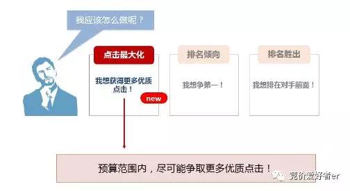 入口二:工具中心---点击最大化。 点击最大化之使用流程 选择关键词:要在哪些关键词上拓展流量,增加点击; 设置出价上限:出价上限=原始出价x设备系数x最高出价策略系数;实际出价=原始出价x设备系数x实际策略出价系数;实际策略出价系数:0.5~最高策略出价系数。 举个例子,A关键词原始出价为10元,投放设备出价为1.5倍,最高策略出价系数设为2倍,出价上限=10x1.5x2=30元;实际出价:7.5~30元 点击最大化之数据报告 提供“策略”和“关键词”层级的数据效果报告,清楚的看到提升效果怎么样? 点击最大化之常见问题 1>几种策略出价的关系是什么? 点击最大化 功能:提升点击 目标:在选定的关键词上,以最优价格拓展更多优质流量 排名倾向 功能1:盯首屏 目标1:在选定的关键词上,尽可能多的获得搜索结果首页上方的展现 功能2:盯前一、前二、前三位 竞价交流群:331845742 目如何在网站上推广自己的产标2:在选定关键词上,尽可能多的获得搜索结果有名次的展现 排名胜出 功能1:盯主域 目标1:在选定关键词上,排名胜出盯住主域名下的所有网站 功能2:盯精准网址,竞价招聘求职群:2微商引流技巧04280119 目标2:在选定关键词上,排名胜出盯住的url(显示url) 关系:一个关键词只能加入其中一种策略,不可同时加入多个策略 2>策略出价系数,是如何作用的? 关键词的最终出价不会高于策略出价上限 出价上限=原始出价x设备系数x最高出价策略系数 3>使用点击最大化出价策略,关键词最终出价可能低于原始出价? 是的,点击最大化出价策略会针对低质量广告降价,实际策略出价系数可能小于1 4>出价策略产品会个其他产品系数叠加连乘吗? 不会,如果出价策略生效,则只会采用出价策略的出价,不在与其他产品出价系数连乘。比如:A关键词既使用了闪投样式,又加入了点击最大化出价策略。如果,点击最大化出价策略生效,A关键词只需付点击最大化出价策略的钱 同时不影响闪投样式的展示概率 5>账户用有2个A关键词,一个加入策略,另外一个会受营销吗? 不会受影响,其计划单元不同,只有加入策略的关键词使用了点击最大化自动出价策略 6>添加关键词失败是什么原因? 对于已经加入某一自动出价策略的词,不能在加入另一自动出价策略 否则就会显示添加失败 7>什么样的计划可以使用出价策略? 出价策略是以关键词为基础进行管理的,所有关键词的计划均可使用 包括计算机优先、移动优先、竞秀等计划,但不包括行业定投计划