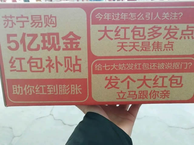 与其他几家平台红包不同的是,苏宁膨胀红包依托电商特性和物流机制,跳出了APP的限制,直接把膨胀红包印在快递箱上进行全国派发,在春节期间,人们会对“5亿现金”、“膨胀红包”等关键字眼的敏感性大大增强,眼球效应明显。
