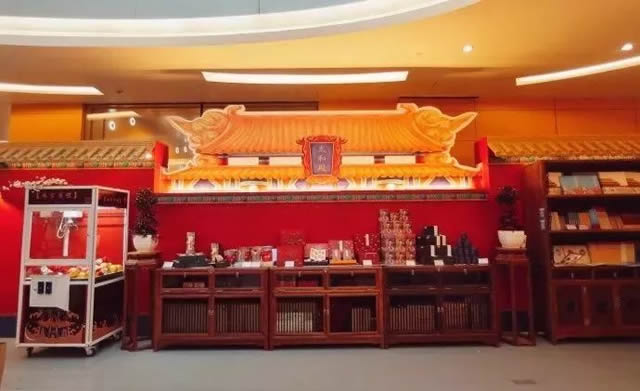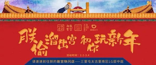这家“朕偷溜出宫,和你玩新年”的快闪店是故宫食品朕的心意联合故宫淘宝、故宫文化珠宝一起开的,从2月2日一直持续到3月4日。快闪店延续了故宫一贯的卖萌耍贱作风,以故宫太和殿为基础进行再设计而成,可以说是“年轻版”的太和殿。