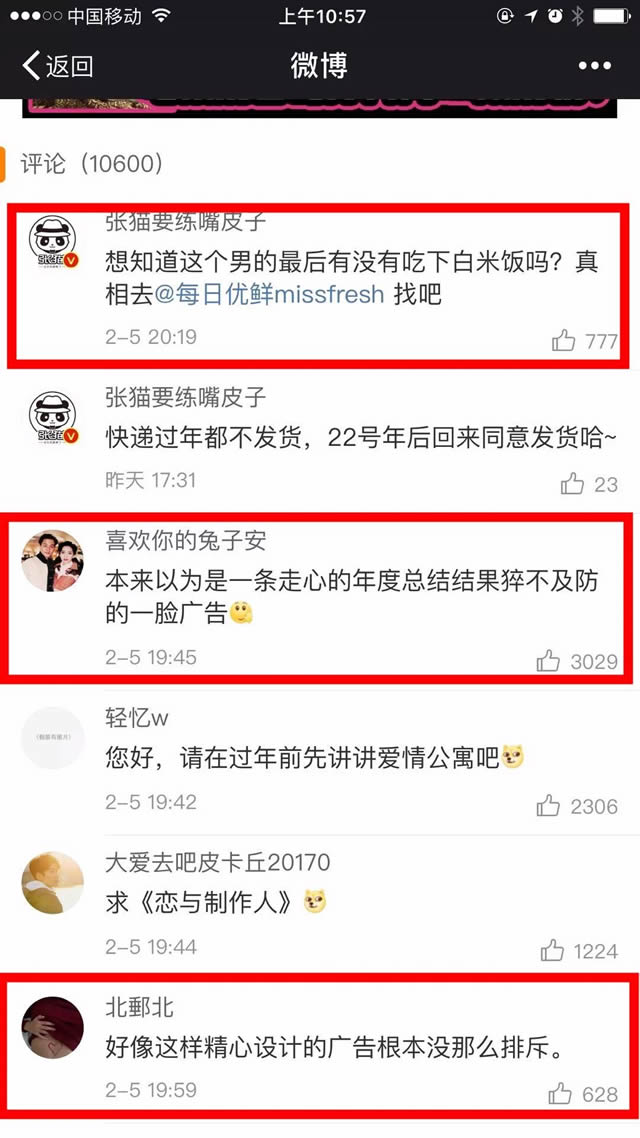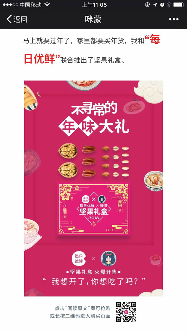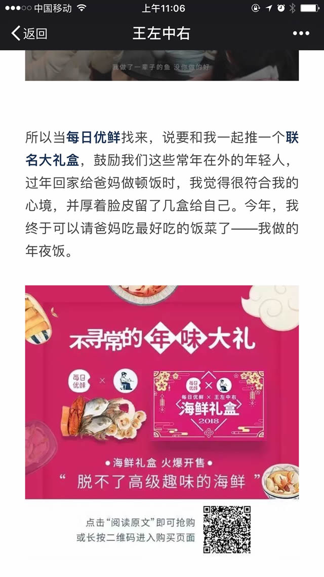 就像主菜之外的调料,正片之后的番外,这些与KOL共创的内容极大地扩展了三支品牌TVC的传播深度和广度,覆盖目标客群。 销量没拉动,叫好不叫座 我们常说,不以卖货为目的广告都是耍流氓,一切传播都是为了激发买买买。春节作为国人冲动消费欲最强烈的节点,自带巨大流量,更是商家不容错过的好时机。而现实情况是,很多广告屏也刷了、榜也霸了、阅读量也10万+了,对销售的贡献却寥寥。 如何将声量转化成销量?每日优鲜的做法是与咪蒙、王左中右、商务范等12名头部KOL推出联名款,创造购买场景,让传播穿透至转化。