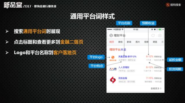 (搜狗品牌广告产品部总经理 李华北) 金融银河通过整合搜狗优质新资源,为金融行业拓展高价值流量,将行业核心内容前置展现,缩短网民决策路径。