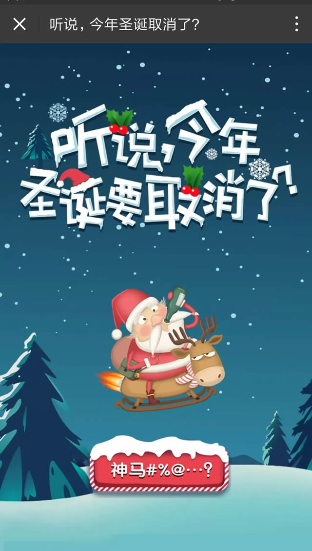 听说,今年圣诞取消了? 圣诞节前夕,“圣诞节要取消”的消息让人忍不住想要一探究竟。到底发生了什么呢?原来是圣诞老人偶然间来到中国,经历了种种沟通不畅带来的磨难,险些无法按时上岗!而这个童话般幽默小故事,则来自于百度翻译推出的圣诞季H5——《听说,今年圣诞取消了》。 品牌之战的硝烟一直弥漫,节日营销已成必争之地。百度翻译今年推出的圣诞季H5, 先以“取消圣诞”为题,用冲突激起受众好奇心,令人忍不住点击;而内容上,百度翻译用童话般的讲述手法贴近用户,从而传达产品和品牌“人性化”“智能化”的信息,直达用户内心。