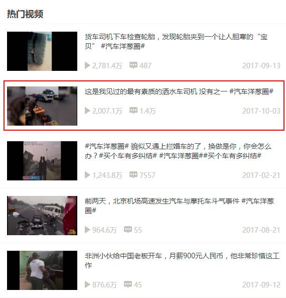 (《妈妈之道》播放量趋势图 ) 除了热点事件的解决方法,一些反常识的内容也会获得不错的分享量。比如母婴、生活资讯等类别的辟谣类文章。《十月呵护》在这方面的眼光就比较准确,其发布的视频《盘点杀死小蝌蚪的谣言》《顺产好还是剖腹产哪个好?》《是不是屁股大的女人就很能生?》和《新生儿乳头到底该不该挤?》都有较好的分享量。这些信息除了给到争议性话题一个标准答案,还代表了分享人的态度,尤其适用于新老辈育儿观念存在分歧的情况。 03、态度鲜明 替观众把说不出道不明的感情表达出来,与观众产生共鸣。如果喜怒哀乐表达到位,那么他们是很愿意主动分享的。观众用你的视频表达立场,立起Flag,分辨敌友。人们需要圈子的认同感,所以有在社交平台上表达态度的需求。 正面情绪: 趣闻是一个很好的类型,能让观众把轻松愉悦的视频内容分享给他人。《有了这个限高杆,月如百万不是梦》这只视频曾在《汽车洋葱圈》《萝卜报告》两档节目中的获得了较高的转发量,视频内容也很简单:行人在3.7米限高杆旁,等待运煤车经过,将其掉落的煤渣迅速收集起来换取收入。这只视频关乎民生,获得了相关观众的热情分享。除此之外,《汽车洋葱圈》还有一只视频《最有素质的洒水车司机》因为避让行人被热情分享,观众称其为“中国好司机”。