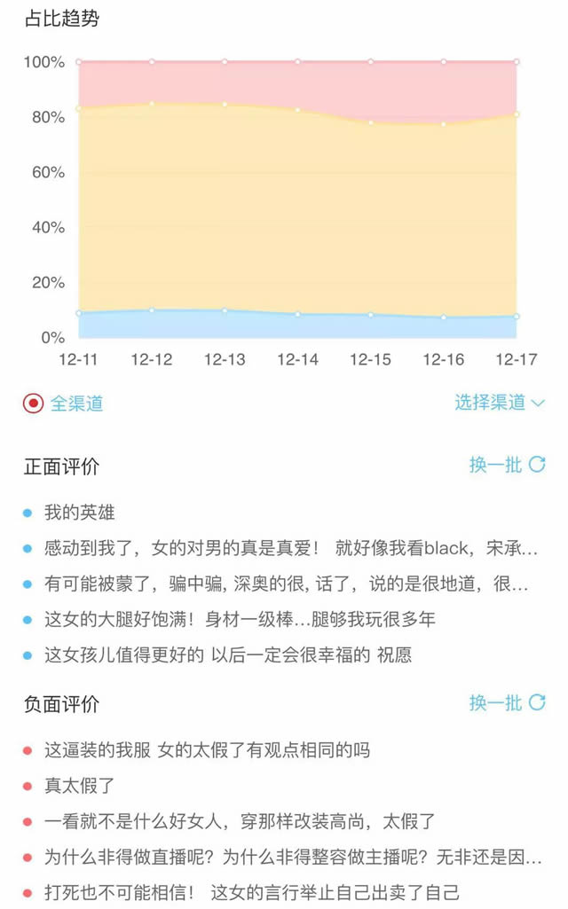 (《叉子恶搞》粉丝情感分析 ) 《papi酱》一直是个个性鲜明的IP,她在视频中多次传达出其平权的态度,视频《合格的现代女性是什么样的?》用了反讽的方式表达了社会对女性的不平等态度。转发该视频的观众也借此表达了自己对现状的认同和不满。 除了面向大众读“宣言”,有些针对个别人的视频也有不错的传播效果。如十月呵护的《月子里老公该做哪些事?》就有不错的分享量,鉴于爸爸时常缺席的国内教育环境,这类视频对宝妈来说,充当着鞭策、提醒的工具。母婴类别中,这种关于“父子/女关系”“夫妻关系”的视频普遍能激起千层浪。 观众更倾向与有喜怒哀乐的内容创作者进行情绪共振,一个有态度的节目是不能满足所有人的,有拥趸就会有反对者,但只有深度用户能佐证其商业价值。选择一个阵营,服务好一部分观众或许是最好的选择。