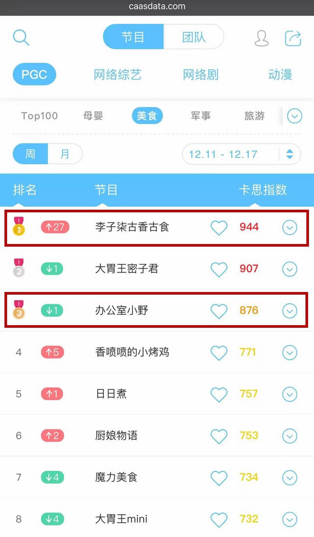 (视频《恶搞版<非常人贩>》) 团队还在评测“北京212”汽车的视频中,神还原黑豹《Don’t break my heart》的MV。节目在影视方面的特长,与同为汽车测评的节目区别开来。 ②美食+ 美食分类的延伸各具特色,且成效明显。有美食+古风的《李子柒古香古食》、美食+创意/职场的《办公室小野》、美食+野居的《野食小哥》《野居青年》、美食+乡村的《欢子TV》《巧妇九妹》等。这些节目均是分类中比较稳定的上榜节目,前两档已经做到了分类头部。美食分类体量大竞争激烈,相对各垂类来说受众更加宽泛。从Top10节目的工业化程度来看,该分类的差异战早就开始了。