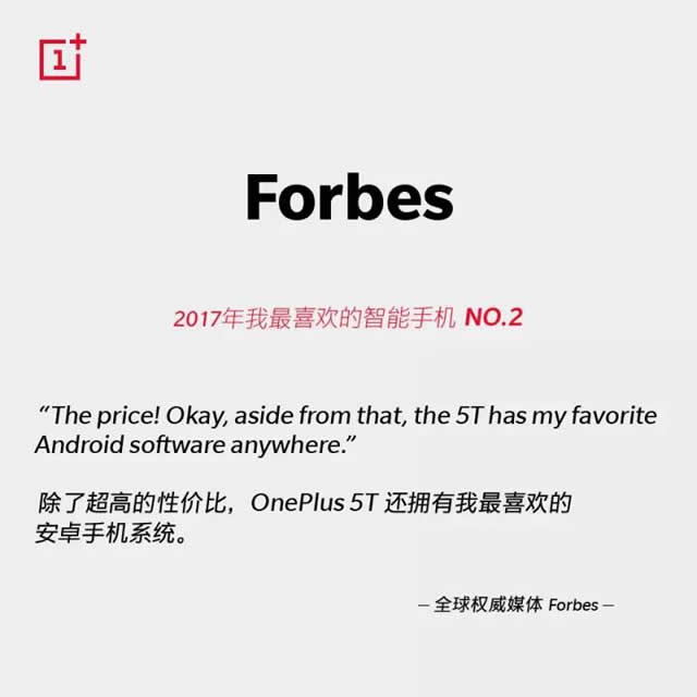 这样一个品牌,拥有海外的官方传播渠道也不足为奇,而ins、twitter和facebook尽管在国内登陆颇为困难,但某种意义上,也被视为“高逼格”的存在。尤其是ins,基于图片传播的ins,活跃着众多顶级博主的ins,时刻出产着高质量的各类UGC,更成为品牌绝佳的传播阵地。 4、NEVER SETTLE 不将就的理念 抛开那些酷毙了的营销点子,回到OnePlus产品本身,你仍然可以强烈地感受到,这是一个充满了诚意的品牌。从最初的第一代产品,到近期发布的一加5T,OnePlus的每一款旗舰机,都保持着业内少有的高标准:优秀的设计感、顶级的硬件配置、超强的使用性能,以及容易入手的价格。即便是在挑剔的海外媒体眼里,OnePlus也绝对是当仁不让的宠儿。 Forbes是一家专门服务于高端群体的门户网站,专注提供商业、财富、科技等资讯报道。