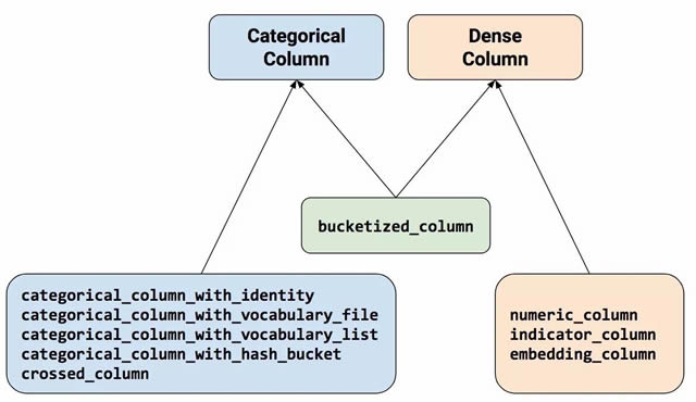 图 2.特征列将原始数据与您的模型需要的数据联系起来 要以特征列表示特征,请调用 tf.feature_column 软件包的函数。这篇文章将介绍此软件包中的九个函数。如图 3 所示,所有九个函数都会返回一个 Categorical-Column 或 Dense-Column 对象,但 bucketized_column 除外,它继承自这两个类别: