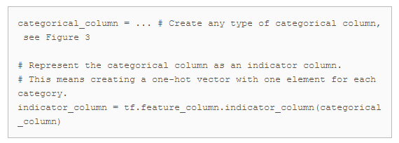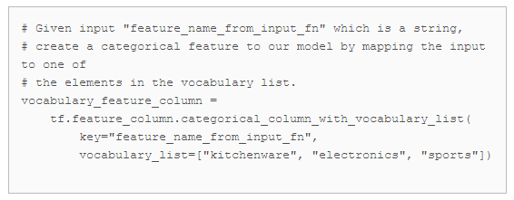 图 6.将字符串值映射到词汇列。 如您所见,分类词汇列是一种枚举版本的分类标识列。TensorFlow 提供了两个不同的函数来创建分类词汇列: a.tf.feature_column.categorical_column_with_vocabulary_list() b.tf.feature_column.categorical_column_with_vocabulary_file() tf.feature_column.categorical_column_with_vocabulary_list() 函数可以根据一个显式词汇列表将每个字符串映射到一个整数。例如: