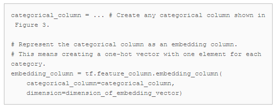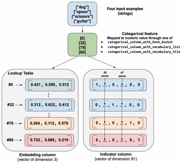 图 10.与指示器列相比,嵌入列会将分类数据存储在一个更低维度的矢量中。(我们仅将随机数字置于嵌入矢量中;训练决定实际数字) 在处理一个示例时,一个 categorical_column_with... 函数会将示例字符串映射到数字分类值。例如,一个函数会将 "spoon" 映射到 [32]。(32 来自我们的想象 - 实际值取决于映射函数。)然后,您可以通过以下两种方式之一表示这些数字分类值: a.作为指示器列。函数会将每个数字分类值转换成一个 81 元素矢量(因为我们的组合包含 81 个单词),在分类值 (0, 32, 79, 80) 的索引中放置 1,在其他位置放置 0。 b.作为嵌入列。一个函数使用数字分类值 (0, 32, 79, 80) 作为查找表的索引。查找表中的每个显示位置都包含一个 3 元素矢量。 嵌入矢量中的值是怎样神奇地获得分配的?实际上,分配发生在训练期间。即,模型将学习最佳方式来将您的输入数字分类值映射到嵌入矢量值,求解您的问题。嵌入列可以提升您的模型的能力,因为嵌入矢量可以从训练数据中学习类别之间的新关系。 我们示例中矢量的大小为什么是 3?以下“公式”提供了与嵌入维度数量有关的一般经验法则: embedding_dimensions = number_of_categories**0.25 即,嵌入矢量维度应等于类别数量的四次方根。由于此示例中的词汇大小为 81,建议的维度数量为 3: 3 = 81**0.25 请注意,这只是一个一般准则;您可以随意设置嵌入维度的数量。 调用 tf.feature_column.embedding_column 来创建一个 embedding_column。嵌入矢量的维度取决于上面介绍的手头问题,但常用值可以从最低的 3 开始,一直到 300 或更大: categorical_column = ... # Create any categorical column shown in Figure 3.