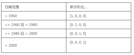 既然数字对模型来说是一种非常有效的输入,为什么还要将它拆分成这样的分类值呢?请注意,分类可以将一个输入数字拆分成一个四元素矢量。因此,模型现在可以学习 四个单独的权重 ,而不是仅仅学习一个。与一个权重相比,四个权重可以创建信息更丰富的模型。更重要的是,由于只有一个元素置位 (1),其他三个元素清零 (0),存储分区化可以让模型清楚地区分不同的年份类别。如果我们仅使用一个数字(年份)作为输入,模型无法区分类别。所以,存储分区化可以为模型提供可以用来学习的其他重要信息。 下面的代码演示了如何创建存储分区化特征: