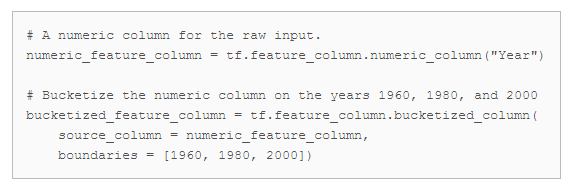 存储分区化列 (Bucketized Column) 通常,您不希望将数字直接提供给模型,而是根据数值范围将它的值拆分成不同的类别。为此,请创建一个存储分区化列。例如,假设存在表示房子建造年份的原始数据。我们可以将年份拆分成以下四个存储分区,而不是以标量数值列表示年份: