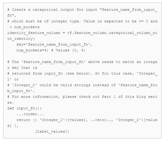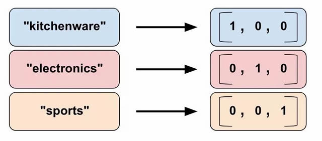 图 5.分类标识列映射。请注意,这是一种独热编码,而不是二进制数字编码。 那么,您为什么想要以分类标识列表示值呢?使用存储分区化列,模型可以在分类标识列中为每个类别学习单独的权重。例如,与使用一个字符串表示 product_class 相反,我们使用一个唯一整数值表示每个类别。即: a.0="kitchenware" b.1="electronics" c.2="sport" 调用 tf.feature_column.categorical_column_with_identity() 来实现一个分类标识列。例如:
