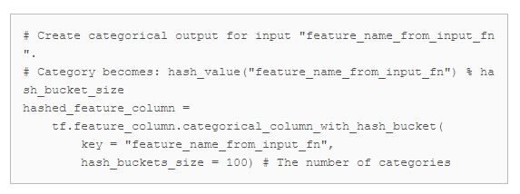使用哈希存储分区限制类别 到目前为止,我们仅介绍了少量几个类别。例如,我们的 product_class 示例仅有 3 个类别。但是,类别的数量通常可以非常大,以致于无法为每个词汇或整数使用单独的类别,因为这样会消耗大量内存。对于这些情况,我们可以将问题反过来并问问自己,“我愿意为输入使用多少个类别?”事实上,tf.feature_column.categorical_column_with_hash_buckets() 函数让您可以指定类别数量。例如,以下代码显示了此函数如何计算输入的哈希值,然后使用模数运算符将其置于一个 hash_bucket_size 类别中: