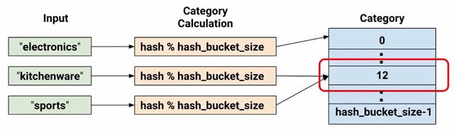此时,您可能会想:“这太疯狂了!”毕竟,我们在将不同的输入值强制放到一组较小的类别中。这意味着,两个很可能完全不相关的输入将被映射到同一个类别,这对神经网络来说也是一样的。图 7 说明了这个难题,显示 kitchenware 和 sports 都分配获得了类别(哈希存储分区)12: