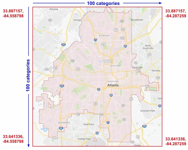图 8.亚特兰大地图。将此地图想象成由 10,000 个大小相等的剖面组成 为了解决问题,我们使用了之前介绍过的一些特征列组合,以及 tf.feature_columns.crossed_column() 函数。