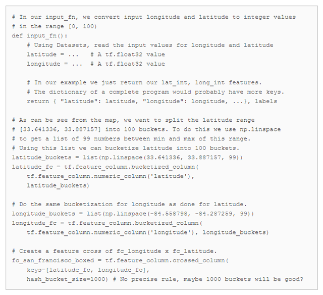 您可以从以下信息之一创建特征交叉: a.特征名称;即从 input_fn 返回的 dict 中的名称。 b.任何分类列(参见图 3),除 categorical_column_with_hash_bucket 外。 当特征列 latitude_fc 和 longitude_fc 交叉时,TensorFlow 将创建 10,000 个按以下方式组织的 (latitude_fc, longitude_fc) 组合: