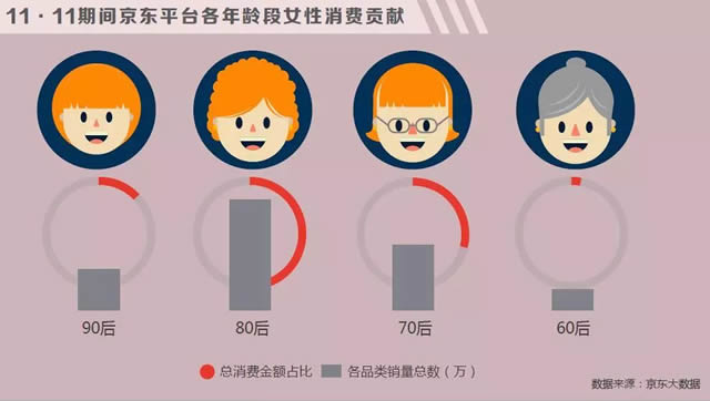 据京东BD研究院发布的《2017女性消费报告》可知,内地女性经济市场规模近2.5万亿元,至2019年有望达到4.5万亿,是未来消费行业的“风口”。 在每年倍增的女性购物大军中,80后以接近50%的总消费金额占比荣登京东女子最大贡献群体,其次是70后和90后。 得女性用户者得天下 25岁到50岁之间的中产女性是品质消费的中坚,一、二线城市依然是消费升级的引领者,是小众品牌、升级产品的主要目标区域,部分爆款产品在个别一线城市销售数量超过全国其它二、三、四线城市消费数量总和,对多数奢侈品、爆款、网红产品来说,占领一线城市市场最关键。