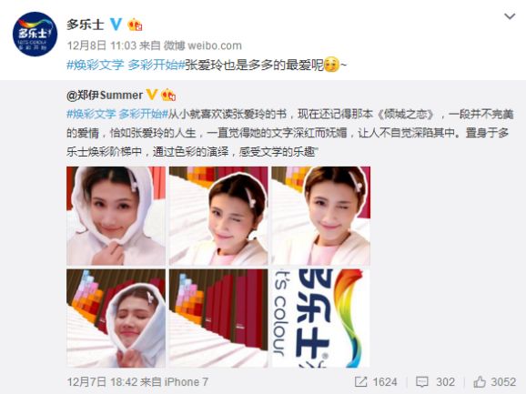 线下体验通过场景化的输出,实现了对多乐士品牌、产品等的多重感知,利用多重色彩的体验让消费者获得感官和心理上的刺激,从而让他们心甘情愿地拍照转发。 3、跨界互动拳,与众作家联动发声音 除了线上线下的一系列活动之外,多乐士发现流量作家马伯庸转发了粉丝为自己制作的焕彩书签,该事件在微博上已经具有了一定的影响力和话题性,借此契机,多乐士及时做出响应,并开始向网友征集喜欢的经典文学中的隽永词句。