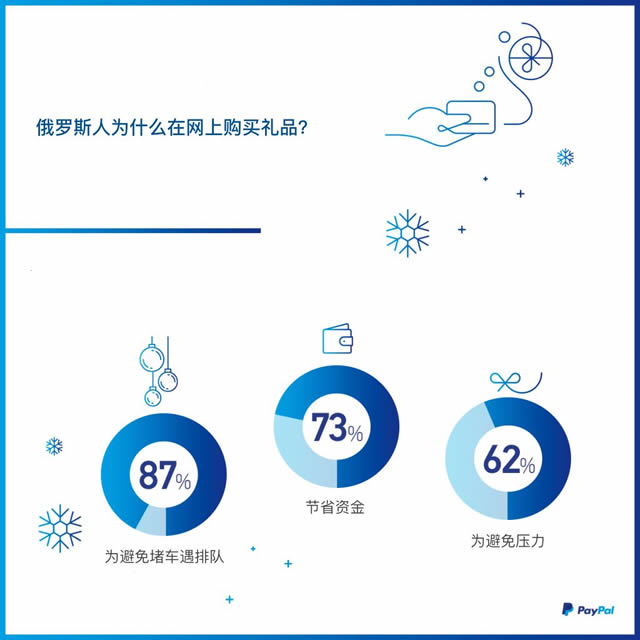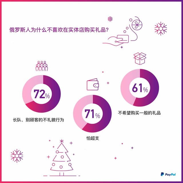 据PayPal与KantarMillwardBrown市场调查公司进行的调查结果显示,由于人山人海、商店排长龙、路上堵车、其它顾客不礼貌的行为等原因,俄罗斯受访者的72%以上不喜欢在新年前去实体店购物。 尽管节日气氛,年礼购物引起精神紧张。受访者的77%表示,完美的礼物挑选与购买过程使其焦急。受访者的74%在买东西时怕数字营销公众号新媒体与企业危机公关超支。还有72%的消费者不希望访问典型的实体店。