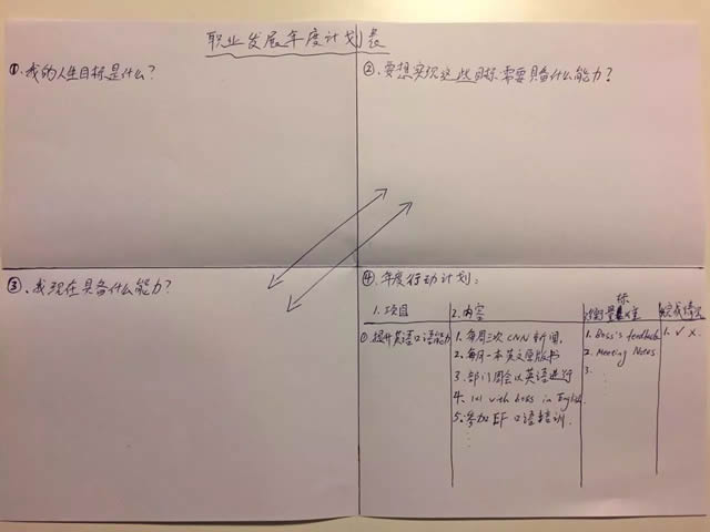 我的人生目标,到底是什么? 此时请千万不要让贫穷限制了你的想象力,大胆的问自己:“如果钱不是问题、时间不是问题、能力不是问题……你这一生最想达成的目标是啥?” 记得当年我第一次回答这道题时,写了满满一整页纸的答案:我想成为成功人士,上时代杂志的封面;我想将来死在一座有着无敌的海景、山景,足球场、游泳池、直升飞机停机坪的大别墅里;我想娶一位貌若天仙的电影明星当老婆;我想35岁以前财务自由,从此周游四海;我想生个儿子,女儿;我想做全球500强公司的高管;我想买一辆豪车… 第一遍写时,请放飞自己的遐想,能写多少就写完多少,反正又不用交税。写完之后,请点着一根烟,深吸两口,平复一下刚才心潮澎湃的心情,然后问自己一个严肃的问题: “这些目标,真的是我愿意穷其一生,矢志不渝,甚至不惜牺牲自己的兴趣爱好家人朋友健康快乐而为之奋斗终身的东西吗?”每次问到这,我通常就开始犹豫了,一些一分钟前还让我激动的死去活来的目标,突然一下就变得没那么重要了。举个栗子来说吧:是否要“娶个电影明星当老婆”?是否要“上时代杂志的封面”?娶个让人羡慕的明星老婆固然好,但是万一HOLD不住她可怎么办呢?会不会有人骂我是小白脸、吃软饭的?是否要牺牲自我啊?听说那个圈子里很乱,会不会让我带绿帽子啊??? 思前想后,我决定还是遵循爸妈的教诲:娶妻求贤淑,找个温柔的、会做面条的、能生养的可能更靠谱吧……半包烟抽罢,你的思绪也整理的差不多了,接下来就让我们把那些“看着很美,但其实并没什么卵用”的梦想统统划掉,把剩下的目标工工整整的抄写到左上角的空间里,然后就可以开始思考第二个象限的问题了。 要实现这些目标,需要具备什么样的能力? 哎呀,我又没有见过这帮成功人士、人生赢家,哪里知道TA们是靠什么取得如此成就的呢?(比如娶明星的阔佬、上CCTV的商业精英……) 没关系,问度娘啊!!上网、看书、看电视去努力搜集TA们的资料,了解TA们的英雄事迹、人生经历、成就点评,囫囵吞枣、无论褒贬统统都读都看,在内心里给这些人先画个像,然后再通过平时刻意的学习和收集使之逐渐丰富。 如果这样还是不行怎么办?简单!那就让我再教你们一个更有效的方法:寻找“孪生兄弟”法(比如“马云第二”;“小乔布斯”;“法律界的凤姐”……)此时请擦亮你的双眼,努力的在你身边寻找那些,和你的目标长得一样(或者在某种程度上长的类似)的人。 注意!我是说行为举止、做事风格、思维方式、能力技巧等等类似,而非单指长相!否则你们会事倍功半、无功而返的!比如说像马爸爸那种长相的人,500年才出一个,你的身边怎么可能有如此神物呢?! 确定了目标人群后,请花点时间注意观察一下这帮家伙:看看TA们具备何种背景(教育程度、职业经历、人生历练),平时如何做人做事,讲话行为,思考问题,甚至连交什么朋友、怎样休闲娱乐、有啥兴趣爱好等都应该关注。 除了“远观”,最好还能“近玩”——请寻找一切之可能,死皮赖脸、厚颜无耻、软磨硬泡地和TA们发生交集,努力走进TA们的职业圈和生活圈(麻友、球友、驴友……),力争成为其下属、变成其小弟、并最终也让自己成为那样的人…… 现在的我,具备什么样的能力? 不吹不黑,客观真实的将自己的能力(职场+生活+兴趣爱好)、经历、优势劣势、教育背景……等一一罗列,力求真实全面即可。 然后逐一的对比第二、第三象限的 Skill List,找出自身还不具备(或者不完全具备)的能力,并把它们带入到第四象限的任务当中去。 年度行动计划,从现在做起 接下来要做的,就是把你的梦想拉回地面,让你每天的所作所为和人生的终极目标挂起钩来,使自己的行为和努力不再盲目,从而最终有效的控制和管理好每个人都会有的困惑——人生焦虑症。 我从内心里,极度鄙视那些四处兜售“职场、人生焦虑症”的知识骗子们:一帮揣着明白装糊涂的老司机,明明知道职业的成功没有捷径,人生的价值在于亲身经历,可却要昧着良心的编出一堆所谓的“套路”“秘笈”“我的成功可以复制”之类的谎言,去骗那些不谙世事的职场小白们的钱,你说可恶不可恶!! 所以说啊,与其每天坐在家里苦思冥想“人生往何处去?”,不如好好的把现在的工作脚踏踏实实地的做好,在把肚子喂饱之前,别给自己整那么多的内心戏。 殊不知你成天摆出的那一副“忧国忧民愤世嫉俗”的嘴脸,不但帮不了自己,还会让别人耻笑,你说你何苦呢?! 还不如好好的听哥的话,从小事做起,从眼前的事做起,当个行动派,认真完成一下右下角的行动计划。 在制定这个计划表时,有一个法则请大伙务必遵循: SMART原则