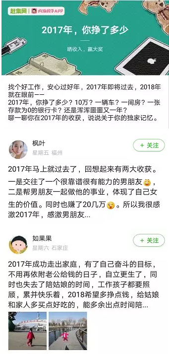 那么,一个由网友吐槽为主的话题活动如何成功演变成一场品牌联合营销事件呢?挖掘背后的亮点及模式,便不得不为两个品牌的营销打CALL。 1. 找准突破点,借节日之势引发情绪共鸣 现在,很多品牌的营销对于新年这样的节日只停留在一波又一波的促销活动,以及向用户的强势曝光。这虽然借上了节日这股“东风”,但缺少点燃用户的一把“火”。用户往往处于一个无情绪感知的状态,那就更谈不上对品牌价值观的认同以及品牌好感的提升了。而赶集网和内涵段子这次选择在一年之终,新年伊始进行这场“2017年,你挣了多少”的营销活动也是颇有心机。对于用户来说,这个时间点大家往往会盘点一年来的付出与收获,尤其是薪资,无论是炫耀还是吐槽,都需要情绪发泄的出口,而这次营销正捅开了这个出口,使得用户参与的积极性持续上涨。在这个新媒体时代,一个好的借势营销,一定是能在恰当的时间点精准触发用户情绪,引起用户的共鸣,这是品牌能否进行高效曝光与渗透的前提。 2. 释放UGC,制造“滚雪球”式内容传播 聪明的品牌往往会选择自己和用户站在一起,给用户一个情绪释放的出口,然后引导用户自发产生内容。品牌利用优质的UGC进行传播,其实更能戳中情绪痛点,人群锁定也能更加精准,让活动更具传播力。此次活动中,赶集网微博评论区的扎心回复更让人印象深刻,引起许多网友集体点赞。 而且,用户在流露各自真实情感写照的过程中,还与其他用户产生了交流,并在线上对内容进行了积极的分享。以“用户的心”去打动“更多用户的心”,这引发了UGC内容成“滚雪球”式传播,品牌活动进行了多重曝光。 此外,其实优质的PGC内容也可以做到与用户感同身受。在此次的营销活动中,赶集网和内涵段子的品牌联合海报正是如此。比如外卖员职业的PGC海报文案, “跑了几万单,存了好几万,却没点过一次外卖” ,这对于那些冒着严寒酷暑,穿梭在城市大小街道的外卖员来说,情绪上略显无奈的文案却揭示了这群人的真实心态。在互联网传播的过程中,用户自身内容的创造力与影响力有时远大于营销本身,这一点值得借鉴。 3. 基于用户共通,联合营销产生品牌溢价 对于成功的品牌联合营销,最重要的就是双方拥有高度重合的同类用户群体。而此次赶集网与内涵段子的联合营销正是以用户属性和喜好为出发点,借助双方资源和渠道共享,让双方的品牌都得到了极大的曝光。对于赶集网来说,作为国内最专业的蓝领招聘平台,品牌要关注的不仅仅是用户的求职状况,更要关注用户的精神世界,进而拉近用户好感。此次活动通过内涵段子的渠道,精准地触达了用户群体,给用户自由吐槽、释放情绪的空间,并引导用户建立“上赶集网,找高薪工作”的品牌认知,树立了一个亲切可信赖的品牌形象。对于内涵段子来说,在段友们自由创作、传播、分享、评论中,独特的社区文化加上与用户自身利益相关联的话题,延伸了其话题活动的影响力,提高网友参与积极性。同时,它也借助赶集网等多重渠道,使得品牌辐射到更多群体。正如一位段友所说,“既要高薪的工作,也要高兴地生活”。此次品牌联合活动正是让用户体会到了这一点。整个活动形成1+1>2的效果,产生了良好的品牌溢价。 一场深入用户内心的品牌联合活动确实应该是这样,基于用户共通,找准情绪点,引导用户互动传播,再加上双方品牌进行优势互补,最终树立起丰富、立体的品牌形象。2017年已经过去,有些人觉得将薪比薪是痛苦的快捷方式,但是高薪的工作也一直是每个人的flag。作为一个专业的蓝领招聘网站,赶集网近几年在不断深耕基层的服务人群,为他们提供优质的招聘服务,帮助他们实现职业理想。而这次营销也成功地引导了用户从关注去年薪资情况到新的一年寻找高薪工作的思想转变,将赶集网的品牌功能进行了深入渗透,实现营销价值的最大化。最后,希望每一个人都能在2018年有更高的收入。