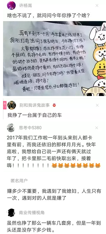 年底了,最近在网上看到不少关于“2017年,你挣了多少”此类话题的讨论,这个时间节点的网友们仿佛都能轻易找到各自生活的槽点,回忆、吐槽、怀念,似乎不说点什么仿佛就与时代脱节,有对过去一年的调侃,也有晒车晒房的炫耀,还有对自己以往付出的肯定……