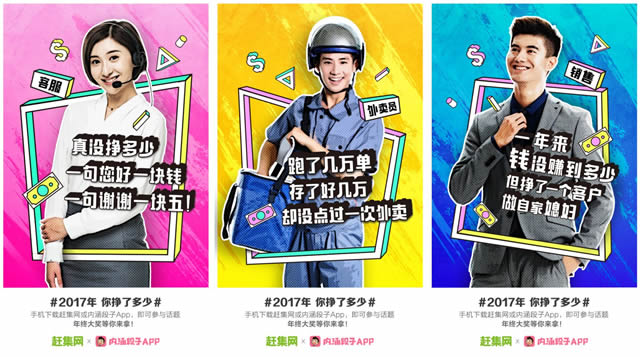 而这场走红的关于2017年挣多少钱的“吐槽运动”其实是由赶集网联合内涵段子举办的,他们为了让更多的用户参与,还特意采访了基层服务职业员工,制作了一组真人式创意海报,用“冷幽默”的方式引发大众对自己过去一年的思考。