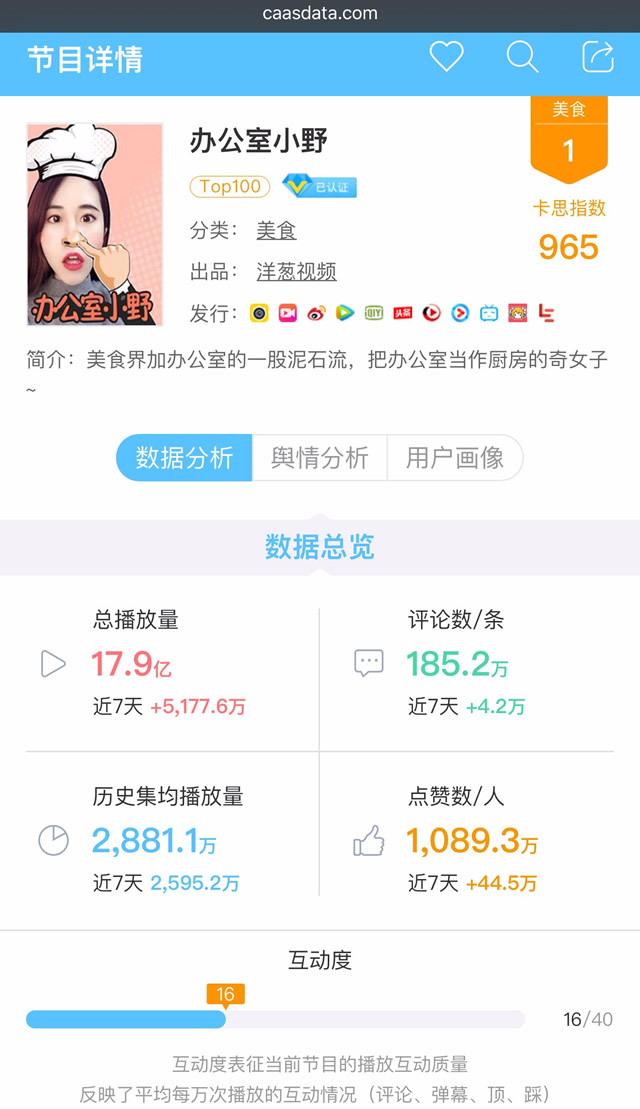 (节目《办公室小野》详情页 ) 这种形式主要有4个优势: ①低门槛无国界,利于全球化传播。打破语言壁垒,利于节目“出海”,非常适合全球化布局的内容创作者。今年升级为“国际野”的《办公室小野》,目前已收获500万海外粉丝(截止到2017年12月),成为亚太地区Facebook粉丝数第三的博主,仅次于阿信和周杰伦。这一切,还要归功于小野从不张口说话的“哑巴”形象。 ②沉浸度高,视频观看质量更高。面对快速且过量的文字、语言信息。默剧的表达形式明显更“清净”一些。没有语言,观众就把注意力放在演员的肢体动作上,揣摩其每个行为的目的。主动挖掘信息,让观众对节目的印象更加深刻。 ③更具场景感,容易引起共鸣。放弃语言,意味着演员只能通过饱满表情和肢体语言来表达情绪。《野食小哥》搬重物时发出吃力的声音,被观众戏称为“话最多的一集,看来是真的重”。把行为和反馈融合在场景里,让观众去感受。 ④做得好的节目,故事完成度普遍高。除了科普类节目,大部分节目需要考察自身讲故事的能力。无语言辅助,说明故事本身已具备足够多的看点,情节冲突亮点完成度比较高。 这种形式也有局限,它不适用于密集型知识类节目。且对演员的控场能力及演技有较高要求,比如无意义的动作都会被观众捕捉到,对内容创作者来说,这是个挑战。 除了有情节设置的节目,还有一些节目也不需要语言来展示信息量。如部分美食/辅食制作类、音乐舞蹈、萌宠类节目,通常伴以BGM+字幕就可表达全部的信息。口播不仅没多大意义,还显得突兀破坏气氛。 02、普通话 mandarin 普通话具有较高的普适性,可吸引到不同文化背景的观众。一般信息量大、科普知识类节目都选择这种普通话作为节目语言。标准发音自带严肃感和权威性,搭配上《了不起的村落》这类的纪录片,就给人庄重的仪式感和严谨的厚重感。 普通话可以表达一本正经,不过在短视频领域,当它上升为播音腔时,通常是带着戏谑的意味。暴走的旁白君,每周字正腔圆地讽刺吐槽着烂片,《阅后即瞎》《法克说片》不仅声音正经,形式更正经,主播正襟危坐煞在摄像机前,开始“一本正经的胡说八道”,用这种形式和内容上的反差给观众带来笑料。 03、方言 accent 方言的用法分两种,一种是丰富人设,一种是制造笑料。 人格化运营的节目,会主动为IP贴标签,方言就是个非常重要的表达方式。不需要说标准的方言,只需要说不标准的普通话就可达到效果。 影剧评节目中,“X分钟看电影”模式的节目同质化比较严重,对差异的需求较为强烈,方言得到了明显的体现。有某个小岛口音的《谷阿莫说故事》,东北口音的《刘哔电影》《刘老师说电影》、新疆口音的《三口看片儿》、广西+四川口音的《菊椒男孩》、四川口音的《阿斗带你看电影》、大连口音的《连长挖电影》等。