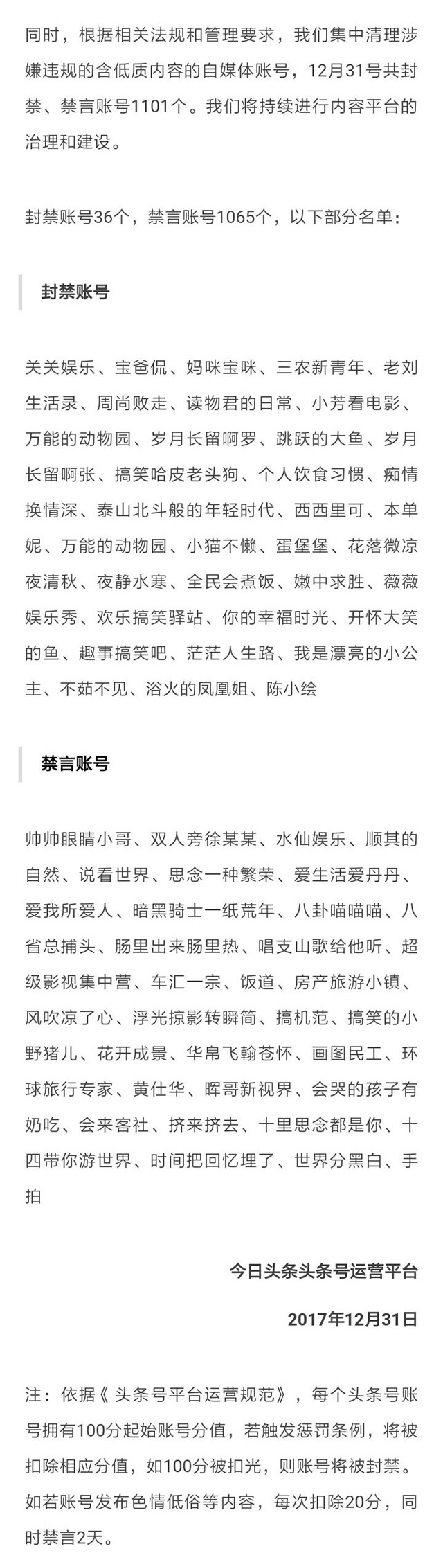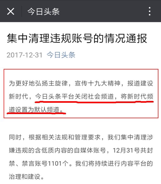 今日头条流量担当「社会频道」关闭了,换成了「新时代频道」,而这个政治频道大家注意了,是没有广告位的!相关人员也直言:对我们的影响是比较大的,具体的影响,还需要过一段时间,才能量化。 量化什么呢?应该是调低2018年的小目标吧… 这就是2017岁末互联网圈发生的大事件,今日头条停更事件,紧接着,平台关闭社会频道,将新时代频道设为默认频道。不清楚的艾豆可以点击查看事件始末:圈子炸了!今日头条客户端停更24小时!!但不管怎样,事情也已经结束,面对停更事件头条也迅速采取了措施,积极应对。 针对此事件将会进行跟踪报道,我们先看下头条官方发出的违规通报,以及频道变更声明: