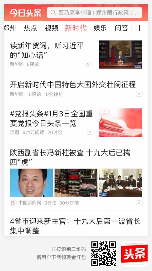 打开今日头条首页,确实可以看到 头条的“社会”频道 已更换为 “新时代”频道(如下图),且内容大多来自于新闻资讯平台,满满的凛然正气之风。 今日头条迅速关闭「社会」频道,把「新时代」频道设为默认首页。似乎给我们一种暗示:社会是低俗的,新时代应扑面而来。低俗社会连忏悔、洗心革面的机会都没有,直接下架,跑步进入[新时代]。