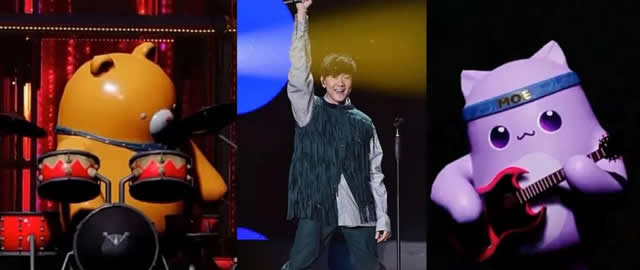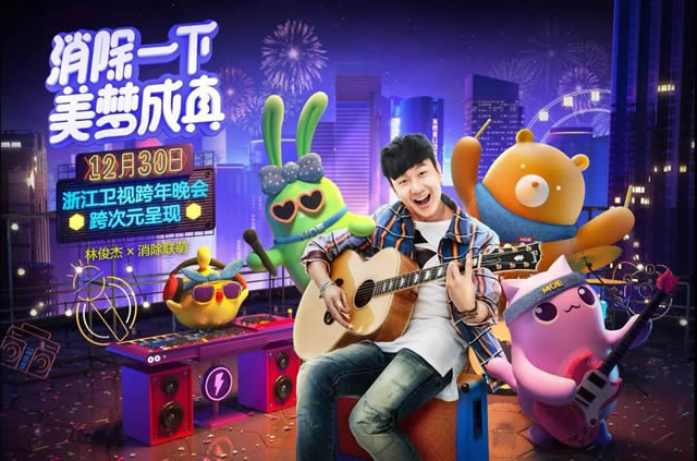 这是虚拟乐团第一次出现在跨年晚会的舞台上。 资深乐评人耳帝对此评论:科技感旋律+现场未消音分贝,模糊了虚拟和现实的边界。科技与潮流结合在林俊杰和来自《天天爱消除》的消除联萌天团演绎中,感觉自己就像是穿梭在音乐符号之间的钢铁侠。 虚拟形象的大众化之路 东亚是虚拟形象产出最多的地区,其中最为繁盛的当属日本,从熊本熊到源自动画lovelive的真人组合 μ's 都曾有广泛的拥趸。 这些形象在影响力的扩散上,一个重要的跳板便是被视作日本跨年晚会的红白歌会。登上红白歌会,意味着它们的影响力已经从二次元人群中溢出,波及到大众人群。 我们熟悉的熊本熊曾多次出现在红白歌会上,而μ's则在2015年的红白歌会上献唱了LoveLive! 第二季主题曲《那就是我们的奇迹》。 “消除联萌”在浙江卫视跨年晚会上的登场亦有同样的意义——它意味着这个衍生自游戏的虚拟偶像乐团,正式成为大众意义上的偶像。 “消除联萌”是由《天天爱消除》联合林俊杰联手推出的虚拟偶像乐团,在2017年4月正式面世,随即推出了单曲《丹宁执着》等。