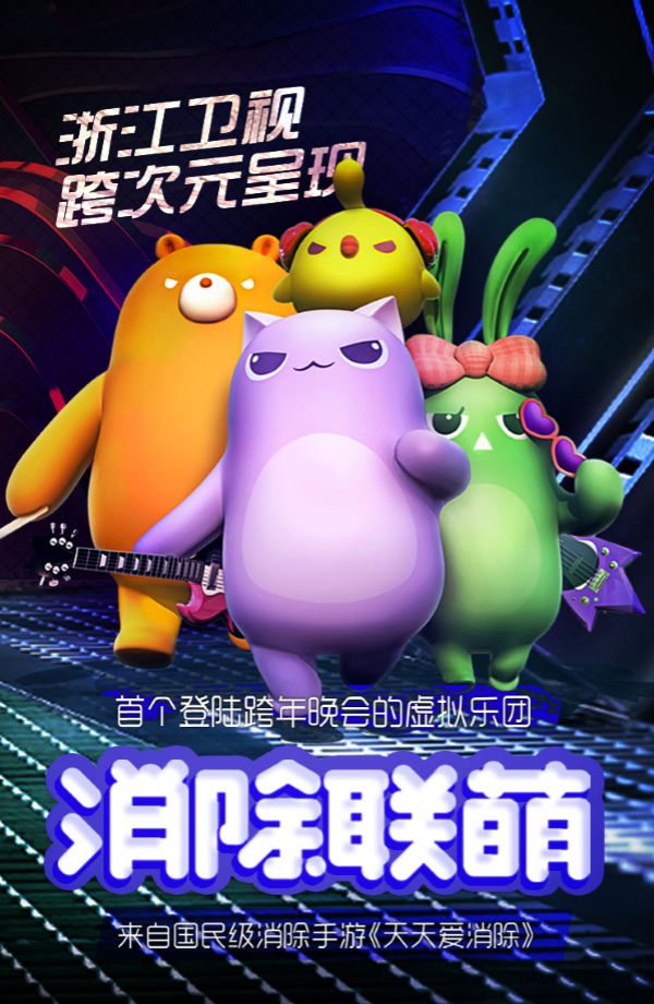 考虑到日本相比中国更为“二次元”的文化背景,“消除联萌”在顶级晚会上的登场相较μ's献唱红白歌会,意义其实更为重大。一方面,它打破了游戏和电视之间存在的载体隔膜,让很多游戏迷第一次得以“跨屏”为自己喜爱的虚拟形象打 Call。另一方面,我们也看到“消除联萌”高质量的演出,让人们对虚拟组合 IP 的内容实力更有信心。 这让“消除联萌”看上去更像是一个内容 IP,而不是一个简单的形象 IP。 以往我们所习惯的虚拟形象,更多是产品的人格化衍生,承担与用户的沟通职能,本身并不会有太丰满的内容卖点。但《天天爱消除》对“消除联萌”的悉心经营,让这个看起来十分轻的 IP 有了更丰满的情感表达和世界观,于是,它能够从虚拟走向现实,被更多人所喜爱。 “消除联萌”做对了什么? 虚拟形象的经营并非一朝一夕的事情,在长时间内试错、调整然后继续尝试都在人们意料之中。对《天天爱消除》来说,从勾勒“消除联萌”形象到在浙江卫视跨年晚会上的登场被,经过了3年时间。虽然未来仍有变量,但他们对“消除联萌”的一些思考已经被验证。 比如在基础的 IP 设定上,要找到与游戏用户兴趣符合的调性。“消除联萌”并没有刻意去营造复杂的世界观和更多角色剧情,而是以更轻的方式去塑造人物和故事,所以我们看到“消除联萌”中的人物个性更加扁平且各有特点,故事的场景也相对日常。 这种 IP 设定方式,让每个玩家或多或少都能在“消除联萌”的成员上找到自己的影子,从而拉近心理距离——它们不再只是游戏中的角色,而更像是一个懂你的朋友。 在IP 打造模式上,《天天爱消除》也有自己的创新模式。同样是邀请明星合作,但《天天爱消除》合作的方式并非简单的代言,而是以“音乐导师”的方式来连接林俊杰和“消除联萌”,共建IP。如此,身为亚洲创作天王的林俊杰,可以将自己在音乐领域十多年的经验赋能于IP。