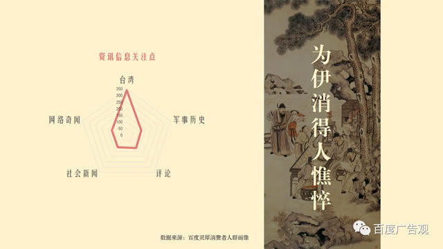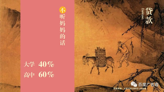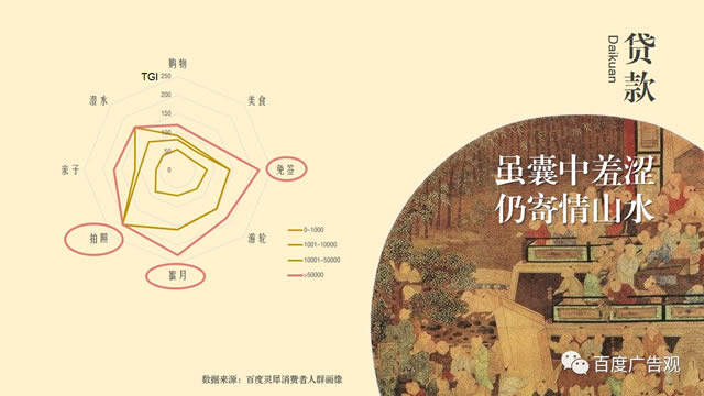 《世说新语》,南朝宋文学名著,主要记载东汉后期到晋宋间一些名士言行与奇闻轶事,遂有大书法家王羲之袒腹而卧、“竹林七贤“之一刘伶嗜酒成性……所写人物气韵生动、活灵活现,名士之百态跃然纸上。 而互联网人群又何尝不是如此百态,搜索引擎更是对这一百态最直观的承载,所搜必为所需,覆盖全国95%网民的百度呈现的更是对真实世界的索引。而历来营销人皆只看到潜在用户群的显性特征/利我特征,而忽视用户作为社会人存在的百态与多样。 今借AI之力,承古风之韵,与大家共享百度金融的“世说新语“。 月均18亿金融检索背后,贷款、理财两大属性最为显著。我们以人性化的方式去解读这两大金融术语,“确实没钱”与“真的有哪些渠道可以引流钱”便是最好的诠释。