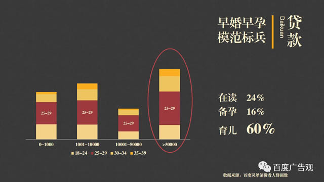 那“确实没钱”的贷款人群究竟是怎样的一群人呢? 他们“不听妈妈的话”,不是传统意义上的好学生,仅有40%完成了大学教育,而理财人群拥有大学及以上学历的比例高达70%。虽然求学之路不尽如人意,但在成家这件事上,非常符合广大父母的心意。年仅25-29岁,76%已处于备孕及育儿阶段。他们少时虽不努力,但非常重视子女教育,年长后也注重自身的职业技能培训。值得注意的是,他们的贷款行为以5W以上的大额贷款为主。