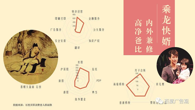 说完没钱的人群,再看下我们“真的有钱”的理财人群呈现的又是怎样的一种百态。 他们以男性为主,80%已为人父母,一半以上消费水平偏高。他们是丈母娘相中的乘龙快婿,事业有成,具有成熟的资产配置经验,更是疼爱妻儿的“吴尊式“绝世好男人。