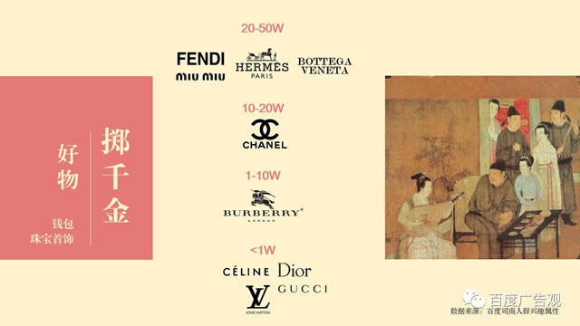 在购物这件事上,他们更倾向购买包袋、珠宝首饰。大额理财人群更偏好Fendi、BV等较小众奢侈品牌,小额理财人群更倾向LV、Dior、Gucci等知名度高的奢侈品牌。