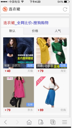 举个例子,当用户通过搜狗移动搜索时,在搜索框输入连衣裙以后,平台会直接把和连衣裙相关的广告以大图的形式呈现在目标用户的眼前,用户只需要点击链接或是图片就可以进去官网或是店铺的详情页了。 2.搜索结果页