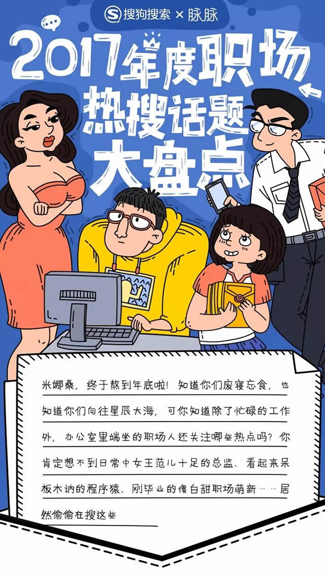 你看到了孜孜不倦、勤奋上进的职场人,也看到了他们三个小时仅青岛活动公关公司写了个题目的Word文档,但他们浏览器和搜索引擎里面的秘密呢? 搜狗搜索×脉脉联合打造 《2017年度职场热搜话题大盘点》 原来攻气十足女总监、万年格衫程序猿、风姿摇曳市场妹…在偷偷地搜着这些…