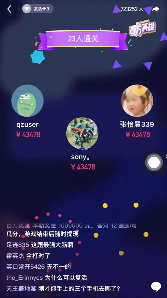 15分钟入手4.3万,时薪直逼胡润榜上的富豪。 这是1月6号晚,西瓜视频《百万英雄》直播问答游戏首个百万英雄场,23位通关网友的惊人战绩!作为被神眷顾的王者,他们从众多同时在线答题的答友中突围,拿下了迄今为止单场最高奖金。