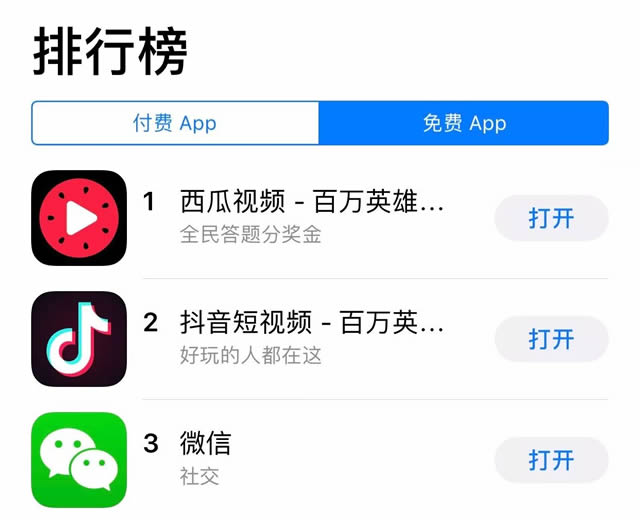 答题赢钱引发全民狂欢的背后,是西瓜视频及《百万英雄》热度的持续上涨。在iOS端,其在APP免费下载榜中的排名也屡屡刷新,目前已经占据首位,排在微信、支付宝等热门应用之前。