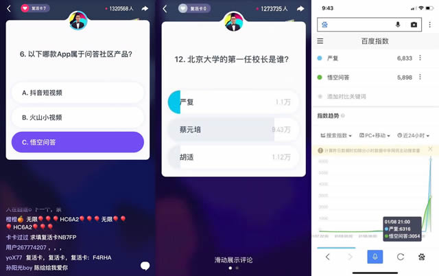 例如, 在1月8号的200万场,今日头条旗下悟空问答植入了问题,悟空玩偶还作为主持人道具露出,悟空问答百度搜索指数随即上涨。1月9日的200万场中,抖音短视频也加入植入阵营,除了给出“以下哪个是抖音短视频的Logo图案”这样的送钱题外,抖音定制抱枕也在活动中露出。此外,基于广告主需求定制的品牌福利专场,也寓营销于娱乐,用奖金调动用户参与,短期迅速帮助品牌深度曝光。