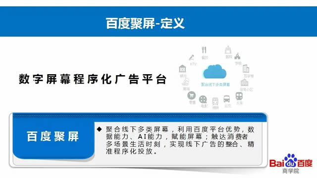 随着技术的不断发展,各种广告形势的普及,越来越多的企业都选择打广告的形势来进行宣传,但是到底应该选择那种方式来进行宣传呢,其实一直是我们在探索在寻找的答案,今天我来和大家分享一款产品——百度聚屏。希望可以帮我们的企业找到最终的答案。百度聚屏具体指的是什么呢? 百度聚屏:又叫做数字屏幕程序化广告平台 通过百度AI,百度联盟将对OTT电视屏、电梯屏、糯米影院屏、交通屏幕等等所有场景的屏幕进行聚合,实现线下广告智能化精准投放。