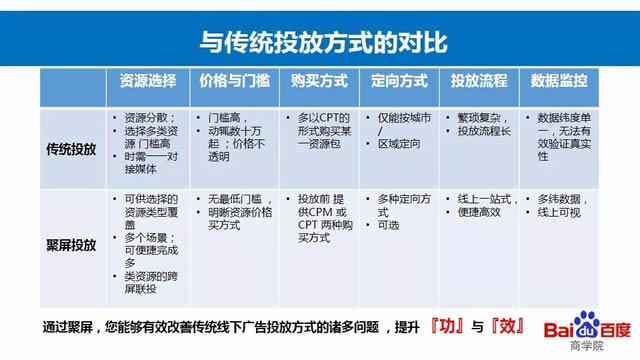 传统媒体广告的投放特点:传统媒体主要存在着前面我们说到的资源分散,想多投就得多媒体都一一选择,门槛比较高,购买方式多以cpt包时段的方式为主,一般只能选择投放的地域,通常投放的流程也比较繁琐,能够看到的数据维度比较单一,对于后期优化会存在一些困难。 聚屏广告投放特点:聚屏广告可以实现资源的多覆盖,自主进行选择,通过后台自主进行设置,通过设置定向的方式实现精准化的人群,同时数据可视化,在后台我们都是可以看到。