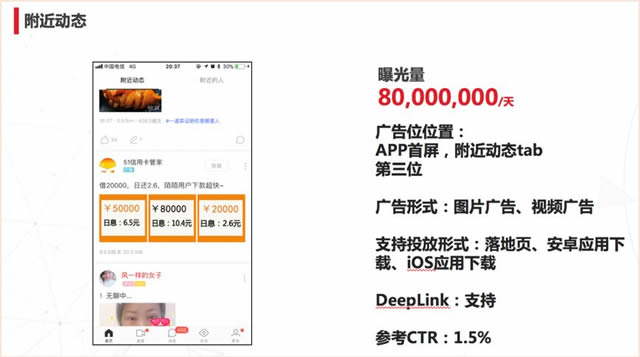 陌陌的广告资源受到客户的充分肯定,目前整体的流量填充率接近100%。陌陌的广告位分为附近的人、附近动态以及关注三大类别。 附近动态以及关注广告位展示的信息比较全,支持视频、三图、大图三种表现形式,附近的人支持图标广告。 1、附近的人广告位