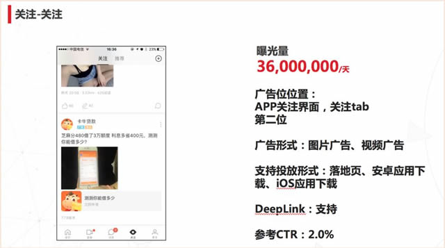 陌陌用户整体非常年轻,男性用户较多,爱表现、爱美并具备高度的表现欲望以及活跃度,对新鲜事物的接受程度很高。 1.人群属性:64%的用户是男性,36%是女性。普遍来说,男性游戏用户多,而且普遍回收比女性好。 2.年龄分布:绝大多数用户集中在30岁以下,超过52%的用户经常参加线下O2O的活动,对新事物的接受能力很强,如果遇到合适的产品,尝试的意愿比较强烈。 3.所处地域:主要分布在沿海省份以及中部经济强省,以一线城市以及苏州、东莞、郑州等外来人口较多的强二线城市为主。 4.付费能力:根据官方的数据,陌陌的直播付费用户一个季度人均付费在500元左右,陌陌用户的付费意愿以及付费能力还是比较强的。 广告资源