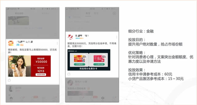 精准数据包 可提供指定设备码或排除设备码进行投放,对于用户量级极大的产品通过指定/排除设备码可以实现召回老用户或找到新用户的目的。 同时平台可为产品专门定制指定人群包,找到与产品最契合的用户,通过精准人群包,产品激活成本可以降低30%~40%。 案例分享 陌陌的用户比较适合什么样的用户呢?根据官方大盘数据显示,陌陌的用户比较适合游戏、金融、汽车以及电商用户。 1、金融客户 小贷类以及信用卡类的产品和陌陌用户属性匹配度很高,目前在陌陌上面投放的此类产品也非常多,卡牛贷款、融360、招商银行都是长期投放的大客户。信用卡的投放成本约为60元,小贷产品的激活成本在15~30元。
