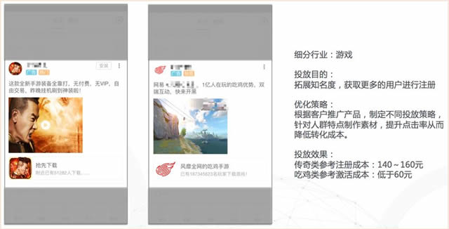 2、游戏客户 游戏客户一直是广告投放的大户,陌陌上长期投放的吃鸡游戏成本低于60元一个激活,传奇类的游戏注册成本在是140~160元区间。