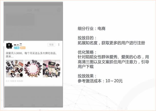 3、电商客户 根据陌陌用户爱美、爱表现、消费欲望比较强的特点,电商尤其是美妆、突发性危机公关案例服饰类的电商是小红书平台流量比较适合在陌陌上进行投放的,目前陌陌上电商类的APP激活成本大约在10~20元这个区间。