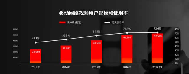 移动网络视频用户规模和使用率 首先给大家看一组数据,2017年中国移动视频用户的规模预计将达到5.25亿,这已经是很大的体量,而随着未来移动用户的规模不断地增大,短视频用户的规模还会越来越大。与此同时,其商业价值也得到了印证:中国的网络视频广告的市场规模增长非常强劲,表现很突出。 网络视频广告有两种形态。如果只看广告的话,一个是视频贴片广告,一个是视频信息流广告。其中,视频信息流的广告占比在增加,我们预测到明年占比将达到40%。